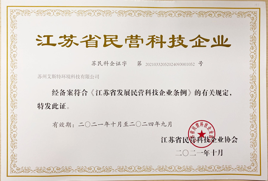 苏州艾斯特获“江苏省民营科技企业”称号